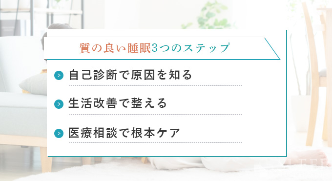 良質な眠りを手に入れるためには、まず自分の睡眠について正しく理解し、必要に応じて医療機関に相談することが成功への近道です。ここまでご紹介した内容を踏まえると、睡眠の質向上に向けた3つのステップが明確になります。
