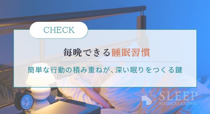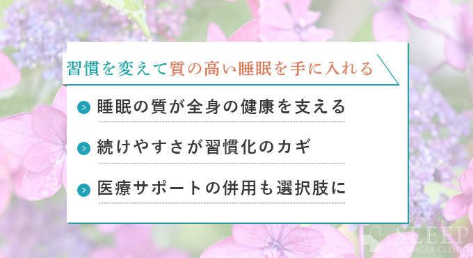 これらの習慣の特徴をふまえたナイトルーティンは、患者様の生活の質を大きく向上させ、睡眠障害の予防や改善に効果を発揮しています。また、「眠りが浅い原因とは?専門医が教える熟睡するための改善法」の記事でも専門医推奨の方法をまとめていますので、ぜひ参照ください。