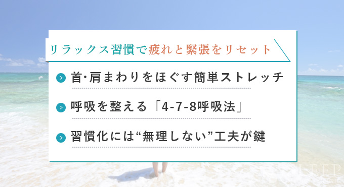 ストレッチは眠りに入りやすいリラックス状態を作るための最も即効性のある方法の一つです。特に、肩こりや首の緊張は睡眠時の不快感につながるため、首・肩周辺の簡単なストレッチを重点的に取り入れることがおすすめです。