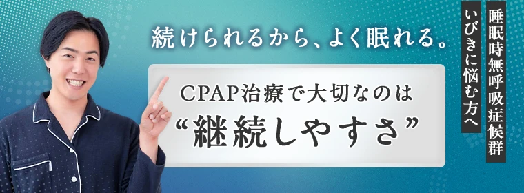 CPAP(シーパップ)療法とは、「持続陽圧呼吸療法(CPAP)」の略で、主に睡眠時無呼吸症候群(SAS)の治療に用いられます。 睡眠時にCPAPを装着すると、鼻から一定の空気圧が送り込まれ、空気の通り道を確保することで、気道の閉塞を防ぎます。 いびきや無呼吸症候群は、睡眠時に気道が塞がることで起こるため、CPAPを装着することで改善を見込むことができるのです。